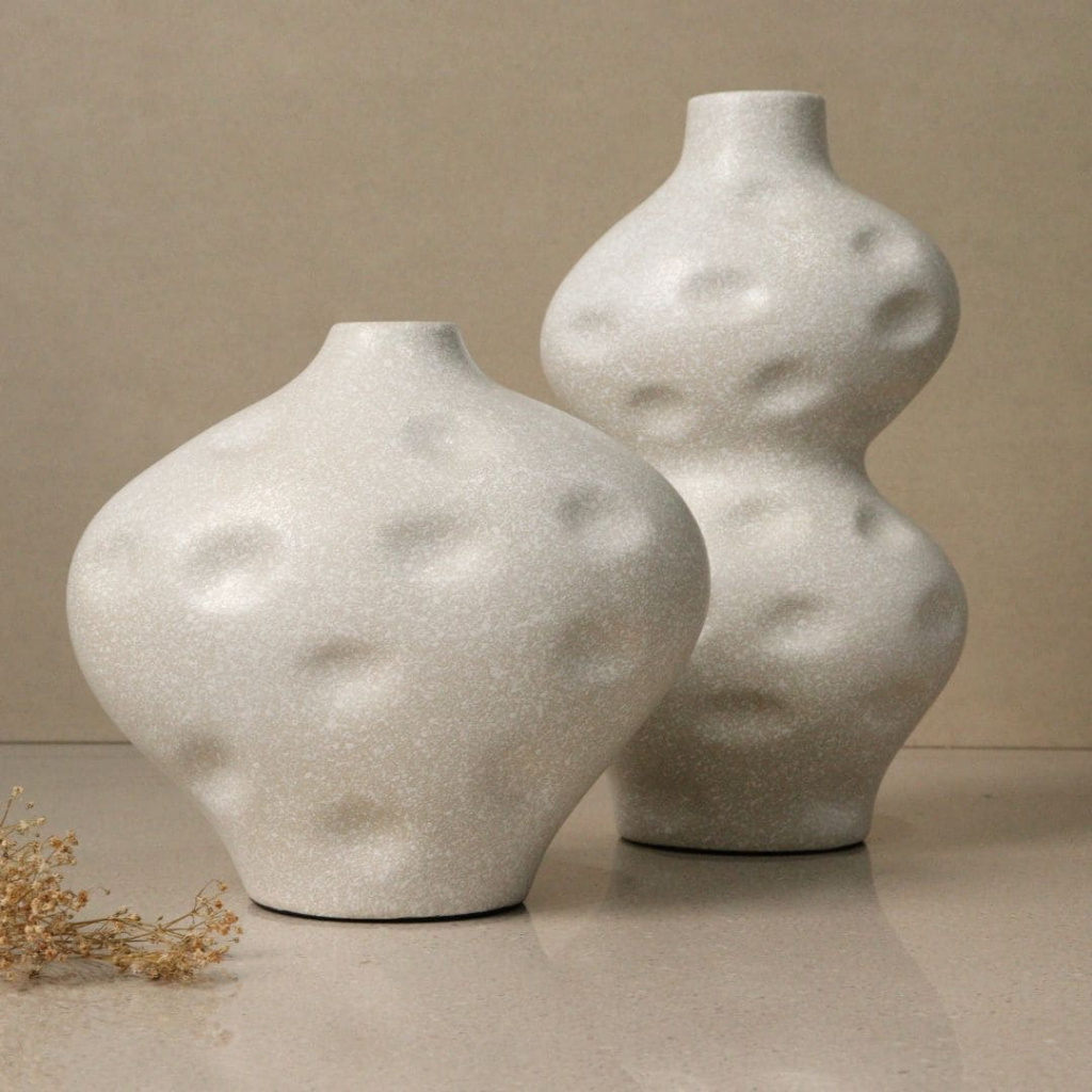 Detalhes do produto: • Conjunto com 2 vasos decorativos em cerâmica artesanal • Design orgânico e escultural, ideal para sala, quarto ou painel • Tamanho do vaso pequeno: 20 cm (A) x 21 cm (L) x 9 cm (P) • Tamanho do vaso grande: 30 cm (A) x 17 cm (L) x 9,5 cm (P) • Peso total aproximado: 1960 kg • Composição: cerâmica de acabamento refinado • Produto feito à mão com atenção aos detalhes