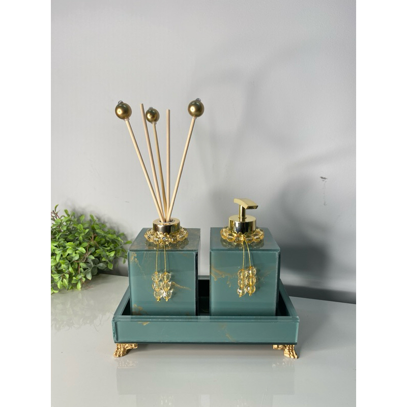 Mais do que um conjunto de higiene, este kit é uma peça de decoração que enobrece seu ambiente com beleza e sofisticação. Frascos cubo com design marcante, pingentes delicados e acabamento marmorizado tornam este conjunto um verdadeiro destaque para lavabos e banheiros requintados.